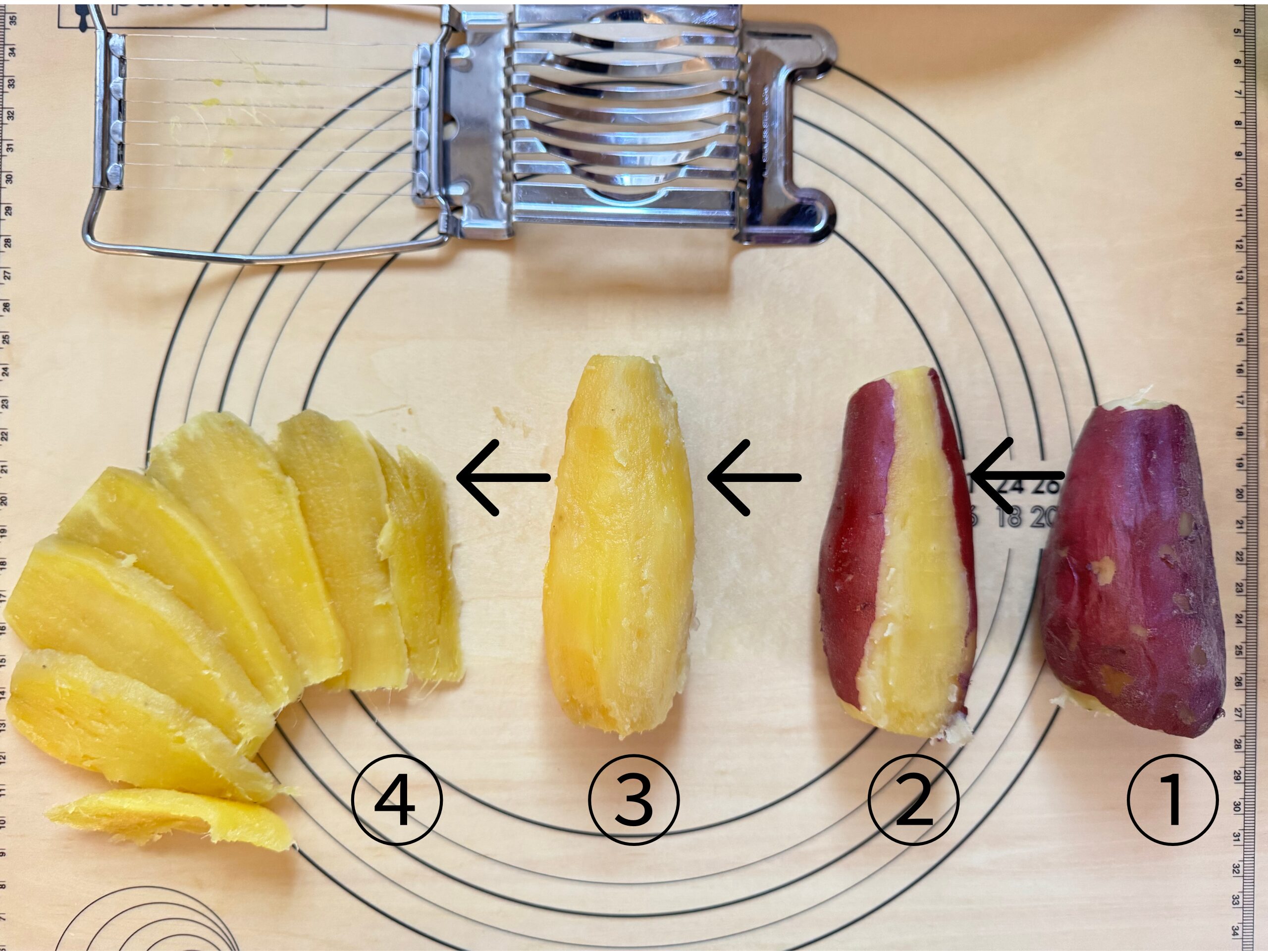 お芋の上下を1cmほど切り落とし、ヘラ等で皮をむき、エッグスライサーで薄くスライスします(エッグスライサーは写真左側の部分だけを使用しスライスします)