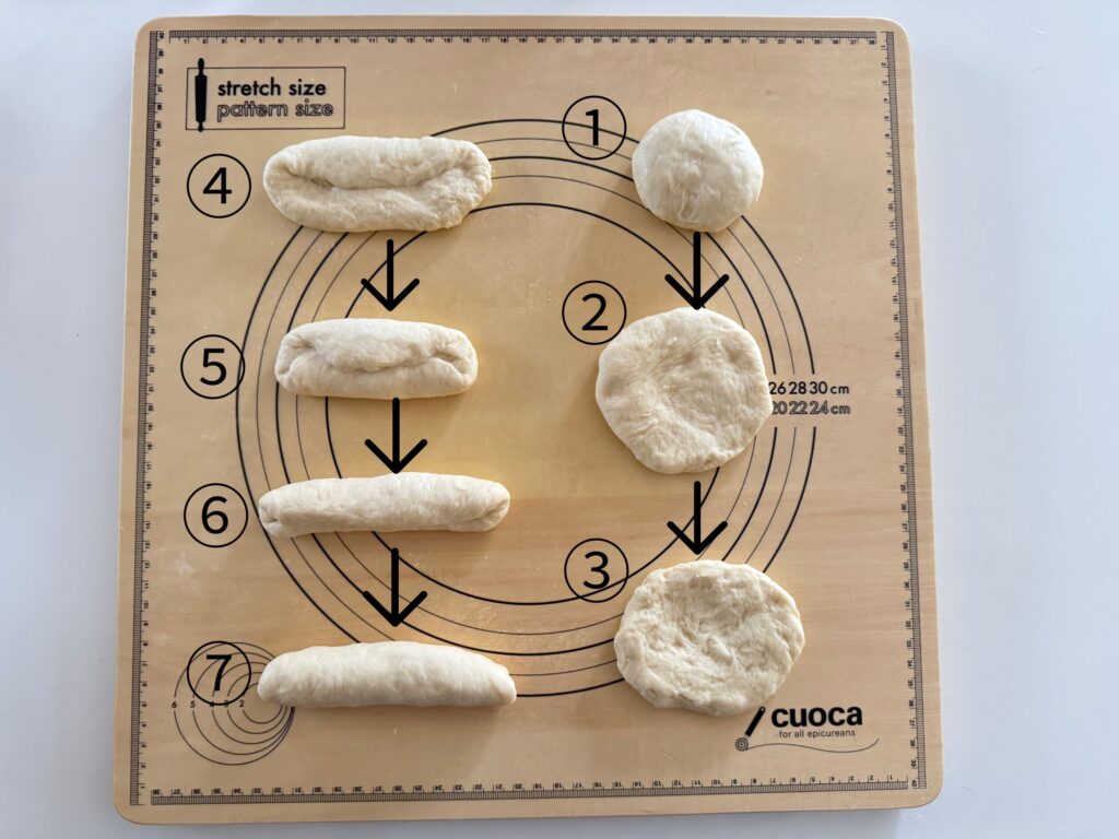 生地を一つ→手のひらで押さえ空気を抜き→裏返し→生地の三分の一を折り→もう片方も三分の一を折り→半分にたたんで→とじ目をしっかりとじ→とじ目を下にします。