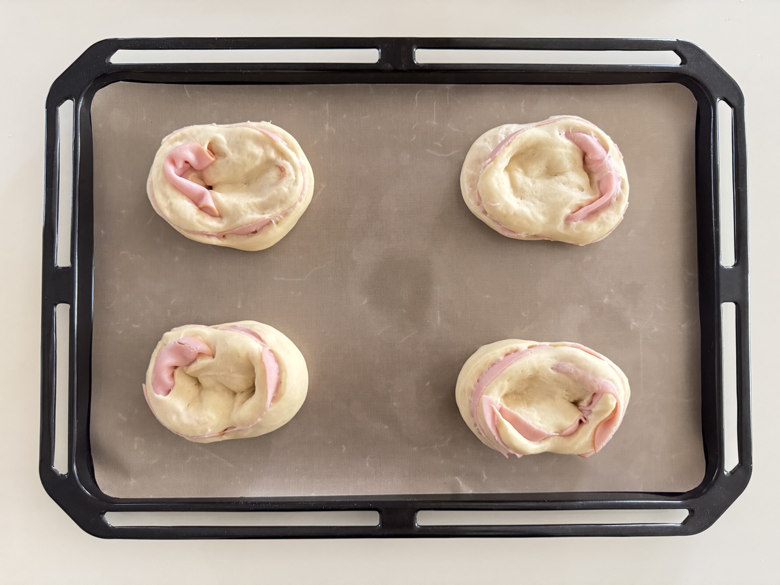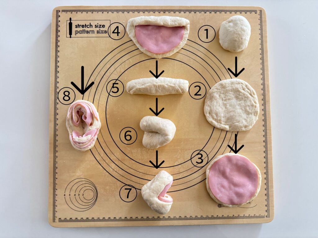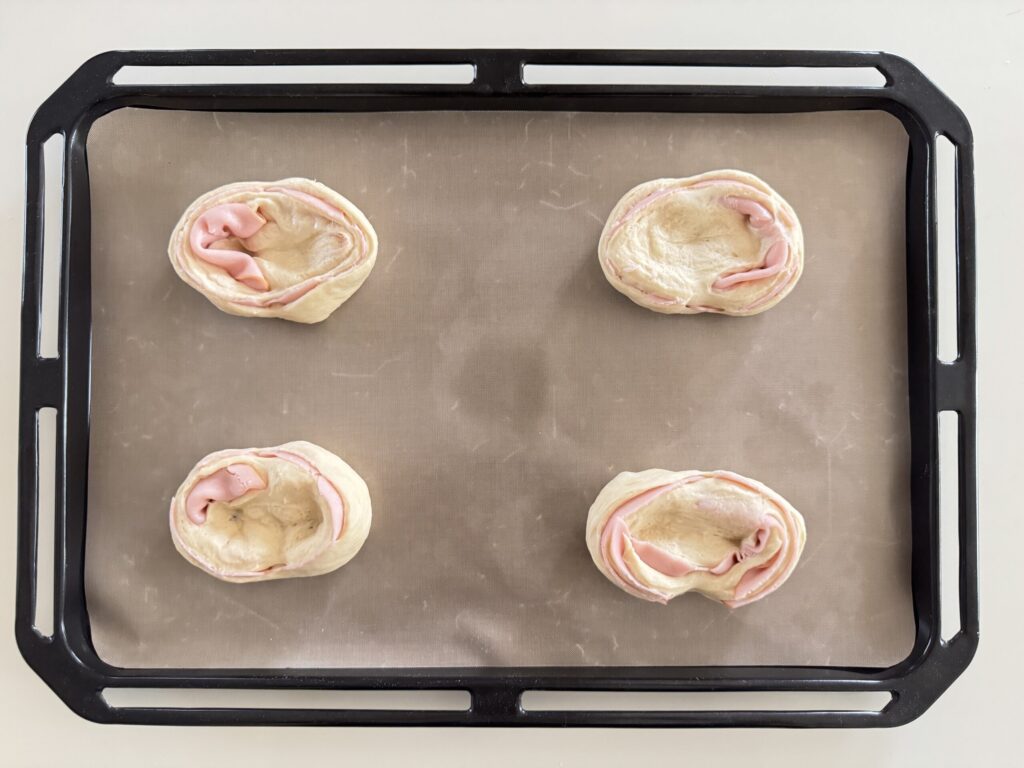 生地を一つ取り→手のひらで押さえ空気を抜き→ハムをのせ→ハムを包み→とじ目をとじ→半分に折り(とじ目内側)→切れ目を入れ(切り落とさず)→開きます。